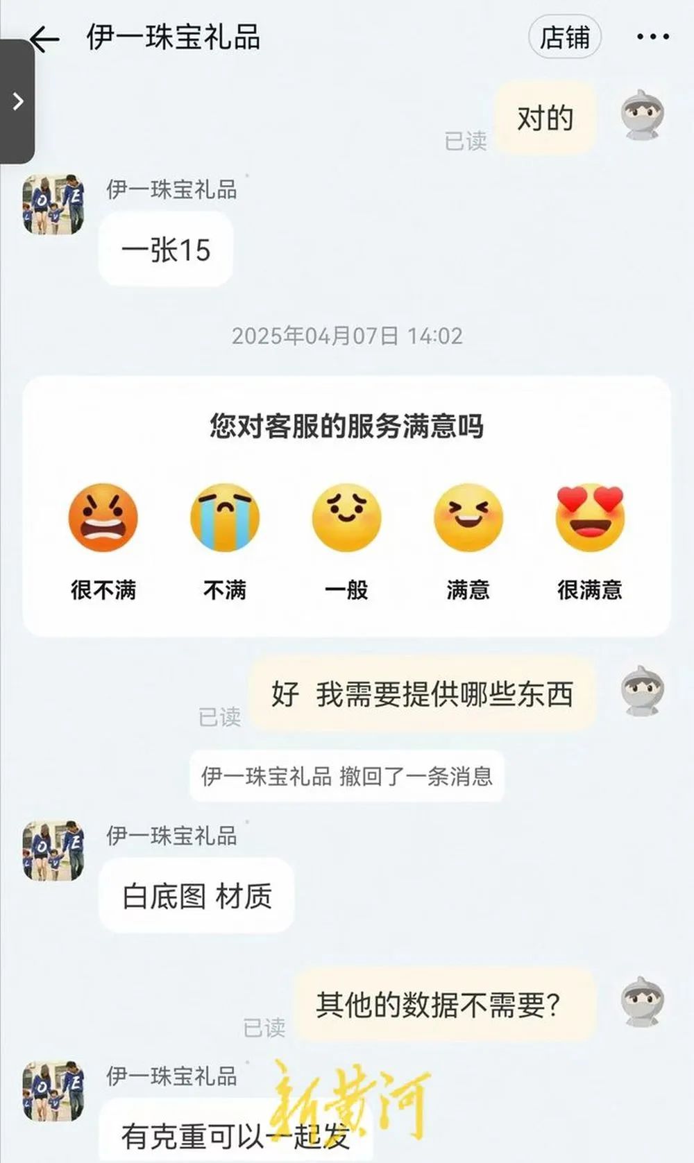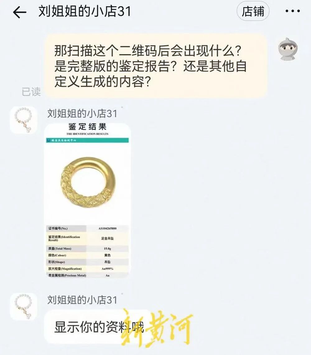 在第一家名为“刘姐姐的小店31”的店铺,客服称单张定制证书15元,两张以上每张12元,批量优惠,价格可详谈,随后便发来相关要求,需要提供1张处理好的商品白色高清图、检验结论、重量、颜色、形状、放大检查、贵金属、备注等信息,称“一图一资料”,并提供了一张盖有某珠宝检测中心公章的鉴定证书供参考。当记者追问扫描定制鉴定证书上的二维码后会出现什么时,客服发来一张标有“鉴定结果”的照片,并称“显示你的资料”。在第二家店铺“伊一珠宝礼品”情况类似,客服称要价每张15元,称“放什么图,扫出来就是什么产品”,并强调其定制证书上的鉴定机构是正规的。