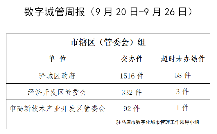 2021年9月20日-2021年9月26日,驻马店市智慧城市服务中心通过采集员、网格员采集上报、视频抓拍、领导交办等途径受理各类城市管理案件4217件,本周应结案4652件,其中已结案4253件、超时未办结202件、因确权争议未处置案件共197件,结案率91.42%,所有案件均通过数字城管系统派遣交办至18个联动单位,经采集员核查,截至9月26日18时,存在超时未办结案件的单位共8个,详细情况如下: