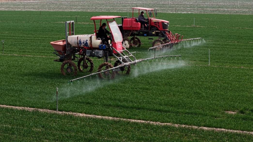 在山东济宁嘉祥县高标准农田里,自走式植保机为返青期小麦喷洒营养肥。人民网记者 王天乐摄