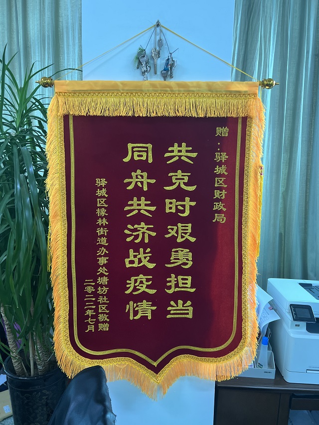 2022年8月4日,橡林街道办事处塘坊社区将一面印有“同舟共济战疫情 共克时艰勇担当”的锦旗,送到了辖区区直分包单位驿城区财政局,对在疫情期间冲锋在前、坚守一线、服务群众、驻守卡点的区财政局工作人员表示衷心的感谢。