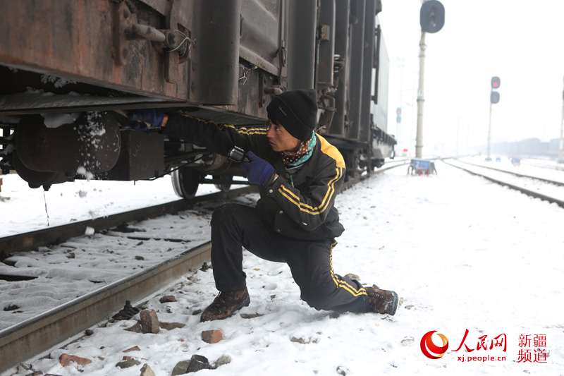 12月8日,乌西车辆段乌西运用车间一场二班检车员王建龙对列车重点部位进行检查,确保货物列车运输安全畅通。 (高鑫 摄)