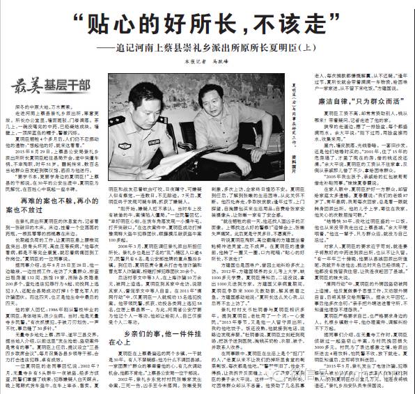 1月10日开始,中央电视台新闻联播、人民日报、中央人民广播电台、农民日报以及河南日报、河南人民广播电台、河南电视台等省内外重要媒体以及人民网、新华网和新浪、搜狐、腾讯、网易、凤凰等知名网站,均在重要栏目重点时段,报道了我省上蔡县公安局夏明臣因公殉职的感人事迹。在百度搜索“上蔡县公安局夏明臣因公殉职”有22500多个相关结果。网友纷纷跟帖赞扬,一时间,河南公安夏明臣用生命书写忠诚的感人事迹在各大媒体传播、被广大网民点赞!