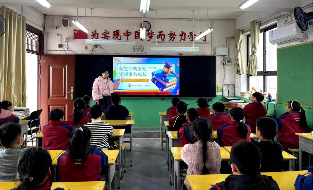 主题班会:各班级围绕“学宪法明事理,守规矩共成长”开展特色活动,班主任通过情景模拟、知识竞赛、案例分析等形式,讲解校园安全、人格尊严等相关法律知识,让学生在互动中明晰法律边界、增强自我保护意识。