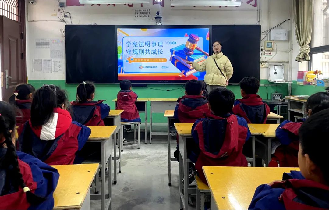 2025年12月1日-7日,驻马店市第三十二小学紧扣“学习宣传贯彻习近平法治思想,推动宪法深入人心”主题,整合升旗仪式、主题班会、校长思政课、名班主任工作室特色活动等多元载体,开展全方位、沉浸式宪法宣传教育,让法治信仰根植童心。