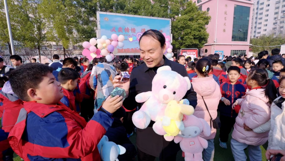 活动现场犹如热闹的小集市,迷你商铺的摊位上商品琳琅满目,摊位前人头攒动。学生们纷纷化身小小摊主、“带货”达人、理货能手,各显其能。“小小售卖员”的吆喝声此起彼伏:“快来买呦,我们这里的物品又多又好!”“谢谢你献出的一份爱心!”“好玩的毛绒玩具,2块钱一个,不要错过啦!”他们用稚嫩的话语为爱心公益尽心尽力,脸上洋溢着幸福的笑容。
