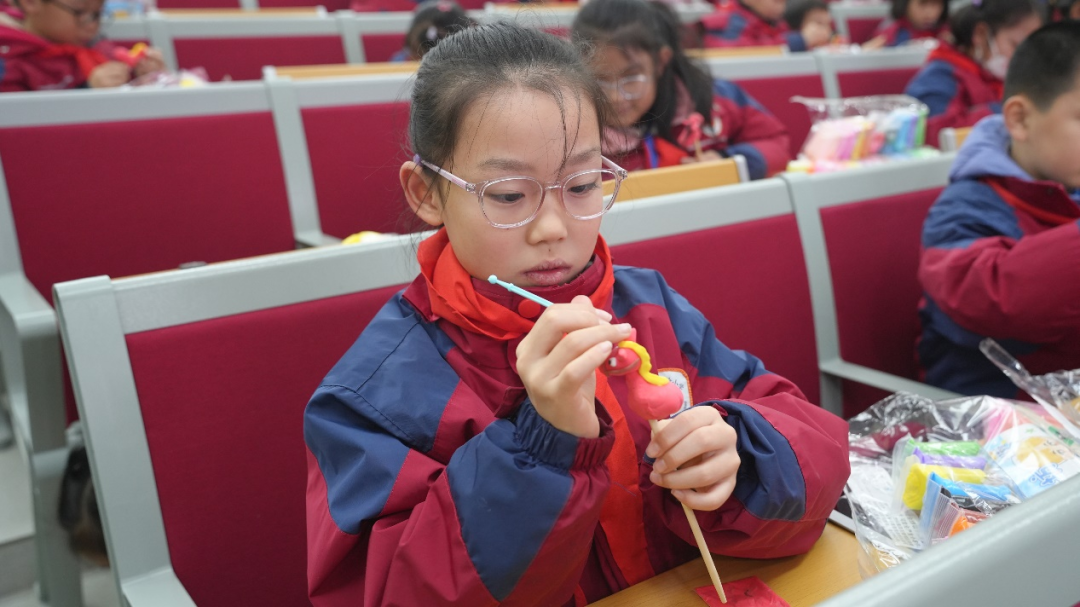讲解环节中,张新芳老师结合自己的从艺经历,用通俗的语言介绍了面塑的历史渊源、制作技艺和文化内涵。“面塑起源于汉代,至今已有两千多年历史,过去是街头巷尾常见的民间手艺,如今已成为国家级非物质文化遗产。”他一边讲解,一边现场演示基本手法:取一块面团揉捏成团,用手指轻压塑形,再用小工具刻出眼睛、鼻子和纹路。短短几分钟,一个灵动的生肖形象便初步呈现。孩子们看得十分专注,也纷纷拿起准备好的面团,跟随老师的指导动手尝试。