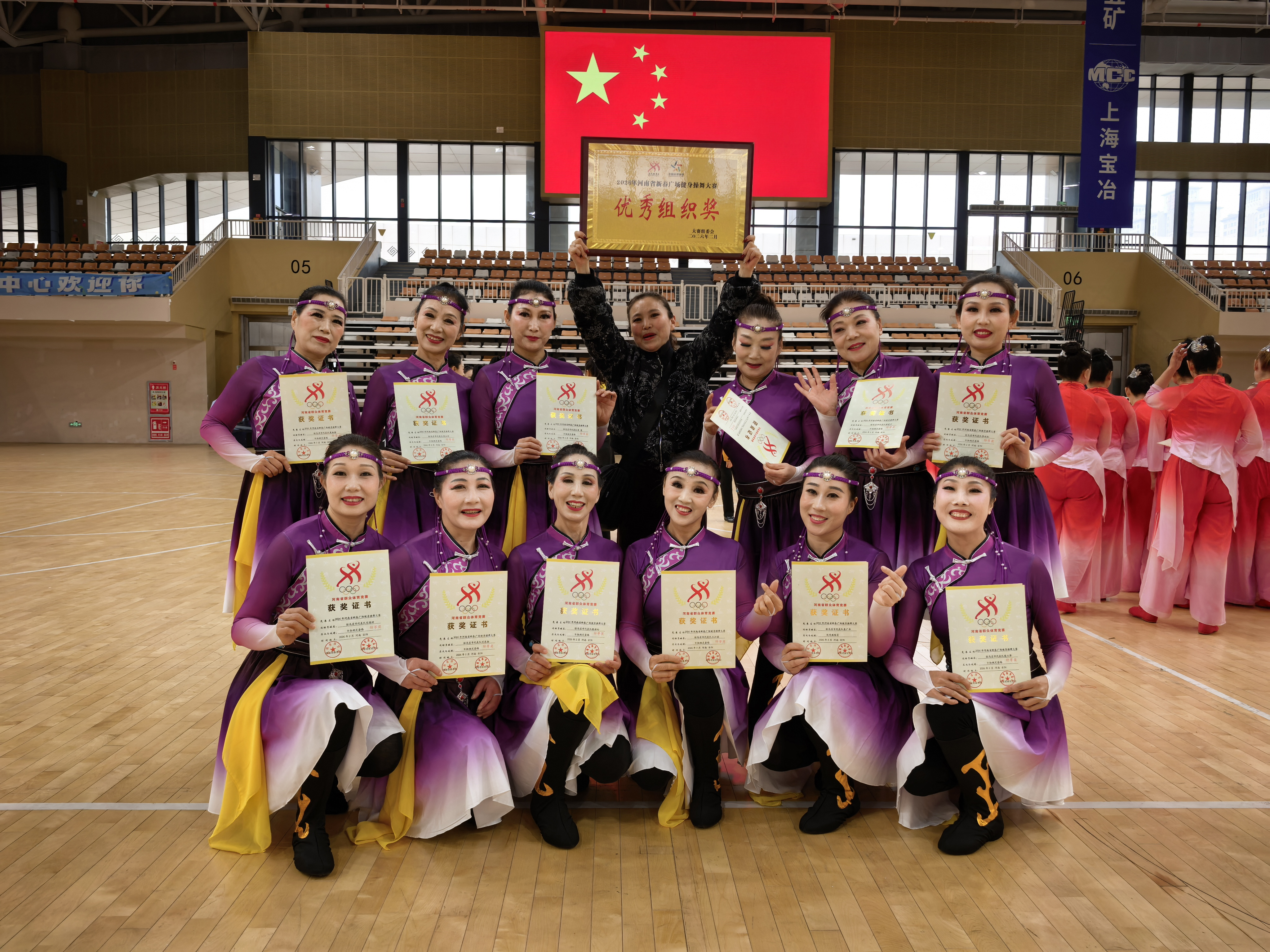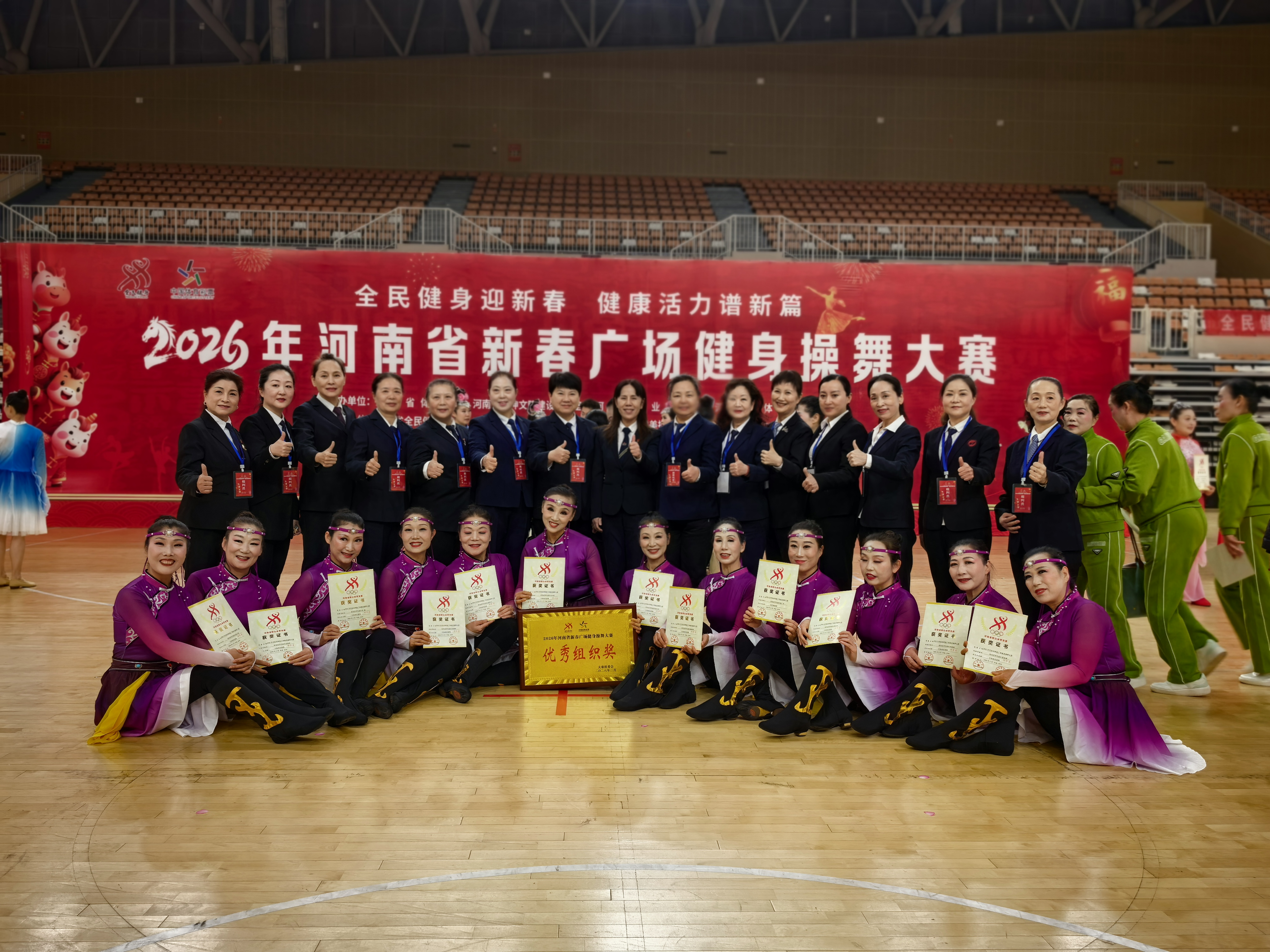 2月27日,2026年河南省新春广场健身操舞大赛在安阳圆满落幕,驻马店代表队载誉而归,荣获规定套路、自选套路两个“特等奖”并获“优秀组织奖”。