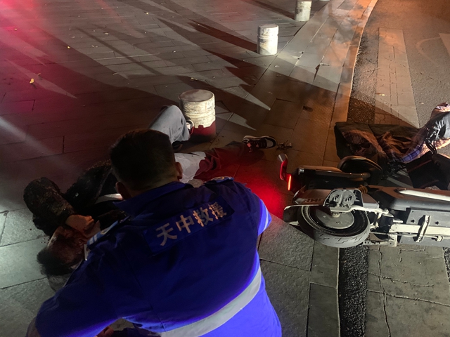 12月4日凌晨1时20分许,驻马店市文明路与置地大道交叉口附近发生暖心一幕。开发区天中救援队红十字救护员王闯在执行完工作任务返家途中,发现一名男子倒在马路边,满脸血迹,其身旁一辆两轮电动车倒地。王闯立即停车上前查看情况。