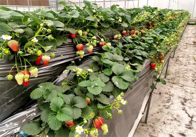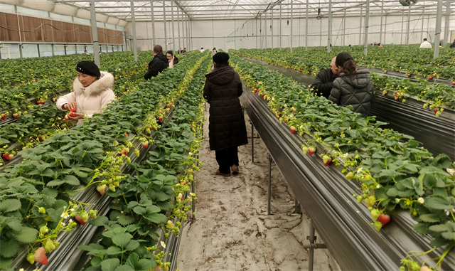 目前,草莓进入盛果期,亩产量可达5000斤,采摘期将持续至五月份。