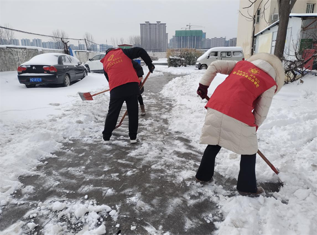 当天,居委会工作人员和志愿者早早来到集合点,大家手持铁锹、雪铲等工具,以雪为令、闻雪而动。在辖区的主干道、沿街路段,及老年人常活动的重点区域,大家分工协作、干劲十足。有人负责铲除路面的厚冰硬雪,有人负责将积雪清运至路边,还有人负责撒盐融冰,全力消除结冰隐患。原本湿滑难行的路面,在大家的共同努力下逐渐变得干净通畅。经过数小时的奋战,辖区内主要道路和重点区域及老年人高频出行路段的积雪基本清理完毕,为居民们尤其是老年群体铺就了一条安全的出行之路。