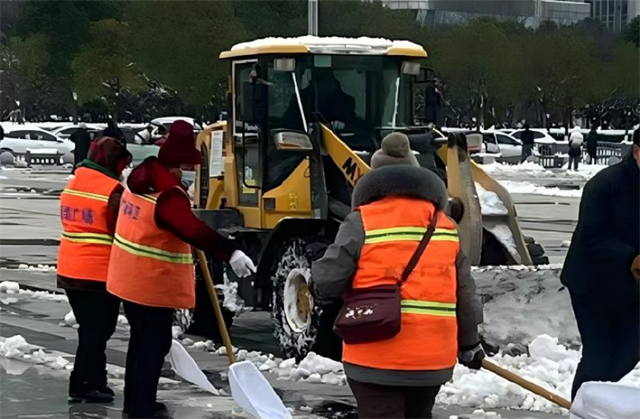 19日傍晚,雪势渐强。区综合执法大队提前部署人员,对广场重点区域及主要出入口开展除雪作业,同步撒布融雪剂,防止路面结冰。