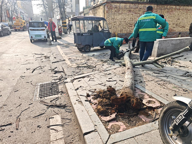 由于作业现场道路狭窄、车流较大,周边商铺密集、线路纵横,作业空间有限,处置难度较高。工作人员第一时间设置警戒区域,疏导过往车辆行人,规范作业秩序。根据树木实际情况,采取“一棵伐除、一棵扶正”的精准处置方式:对严重倾斜、无保留价值的树木进行专业伐除清运:对根系完好的树木进行扶正加固。全程规范操作设备,及时清理路面残枝杂物,快速恢复道路畅通。